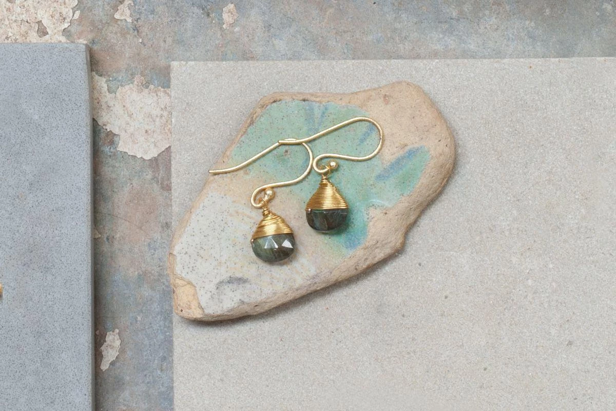 These Labradorite stone drop earrings are set in 22 karat gold fittings.
