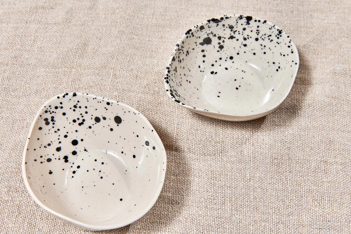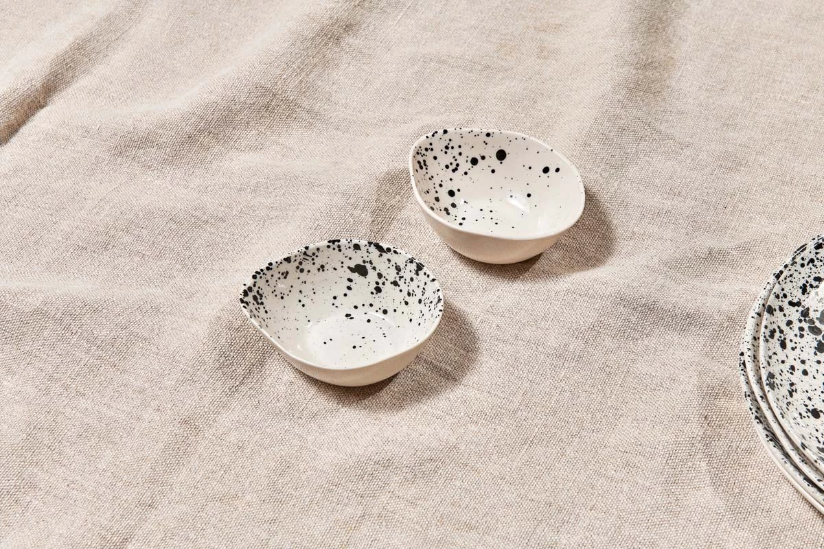 Our Ama dipping bowls are the perfect size for holding vinegars and oils. The elegant oval design and striking black splatter finish add to their charm. Each one is handmade from stoneware using traditional techniques.