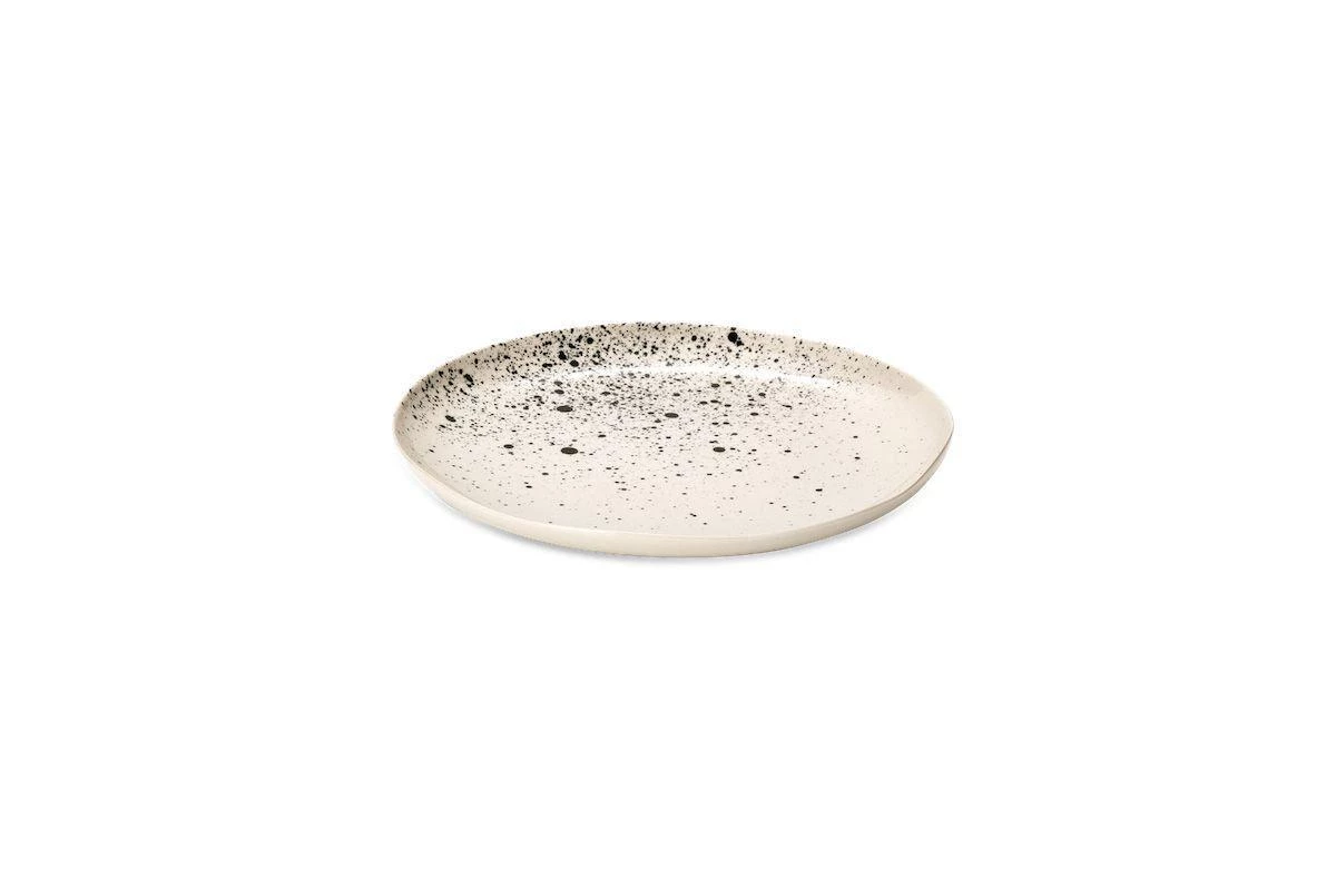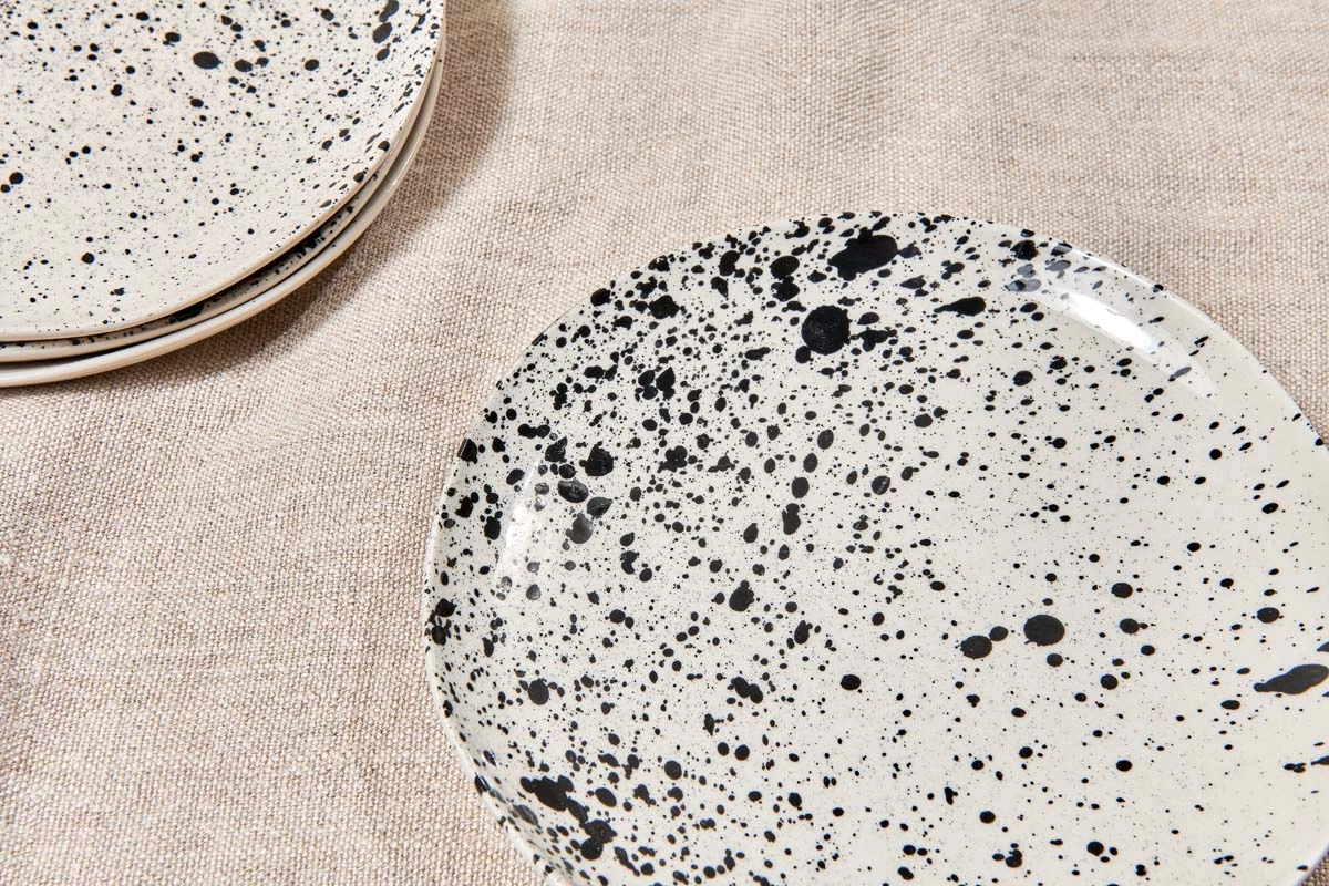 These striking side plates and dinner plates form part of a full dinner service, they are handmade and decorated with a black splatter pattern that looks stunning as a table setting.
