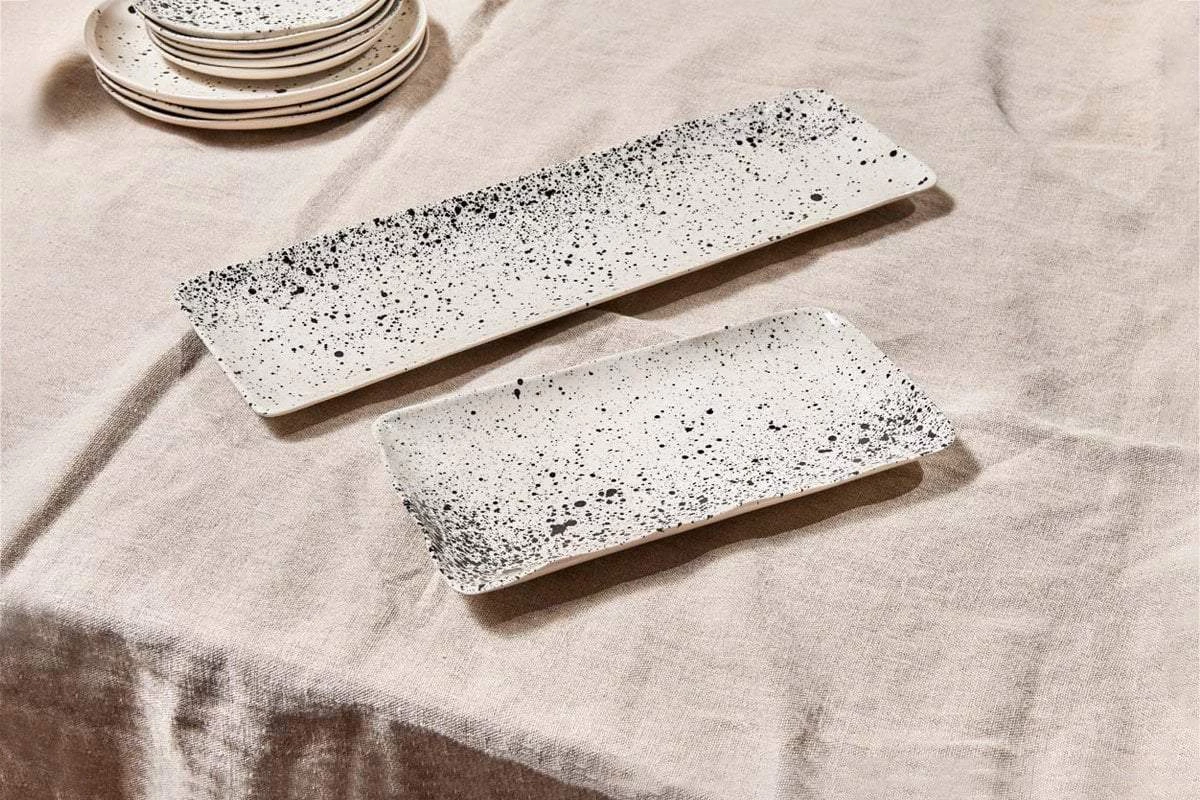 These large oblong serving platters have a smooth glaze that is decorated in a striking splatter pattern.