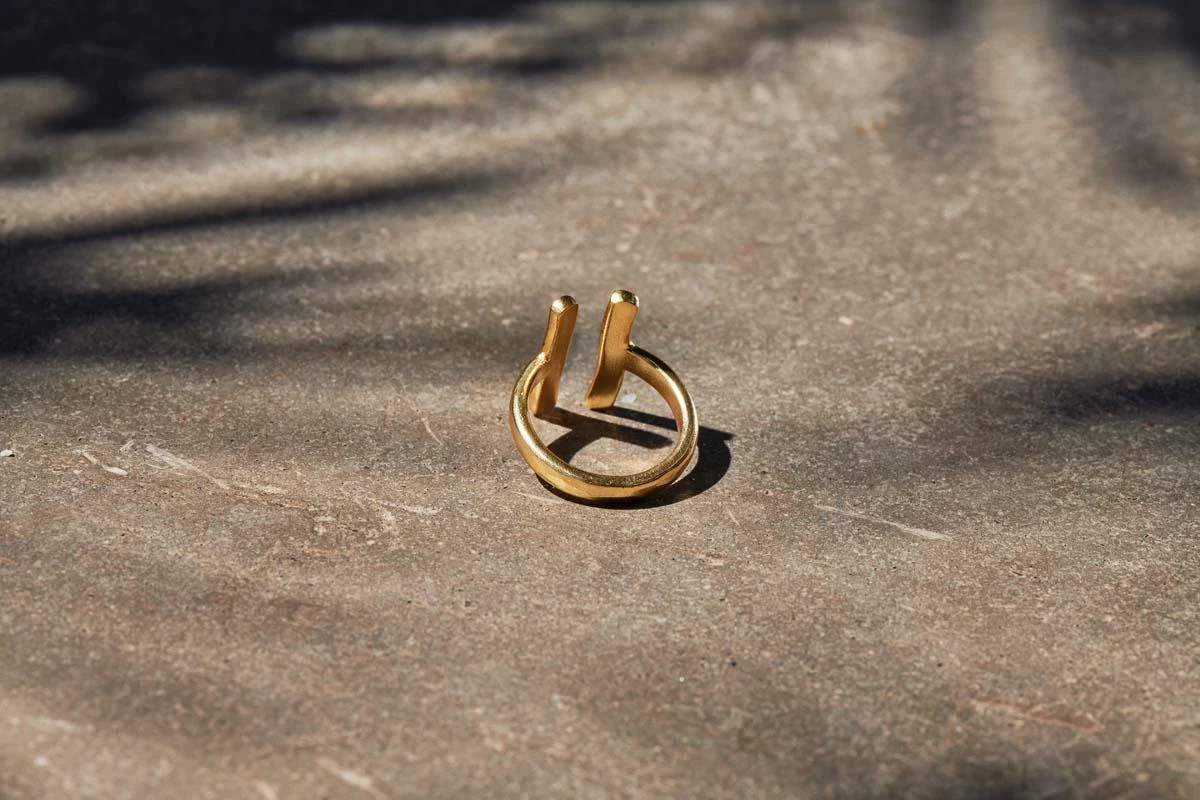 The double bar design of our Atili Ring is handcrafted from 22 karat gold. The bars have an organic texture that is created with a light hammering technique. The ring has an adjustable gold band.