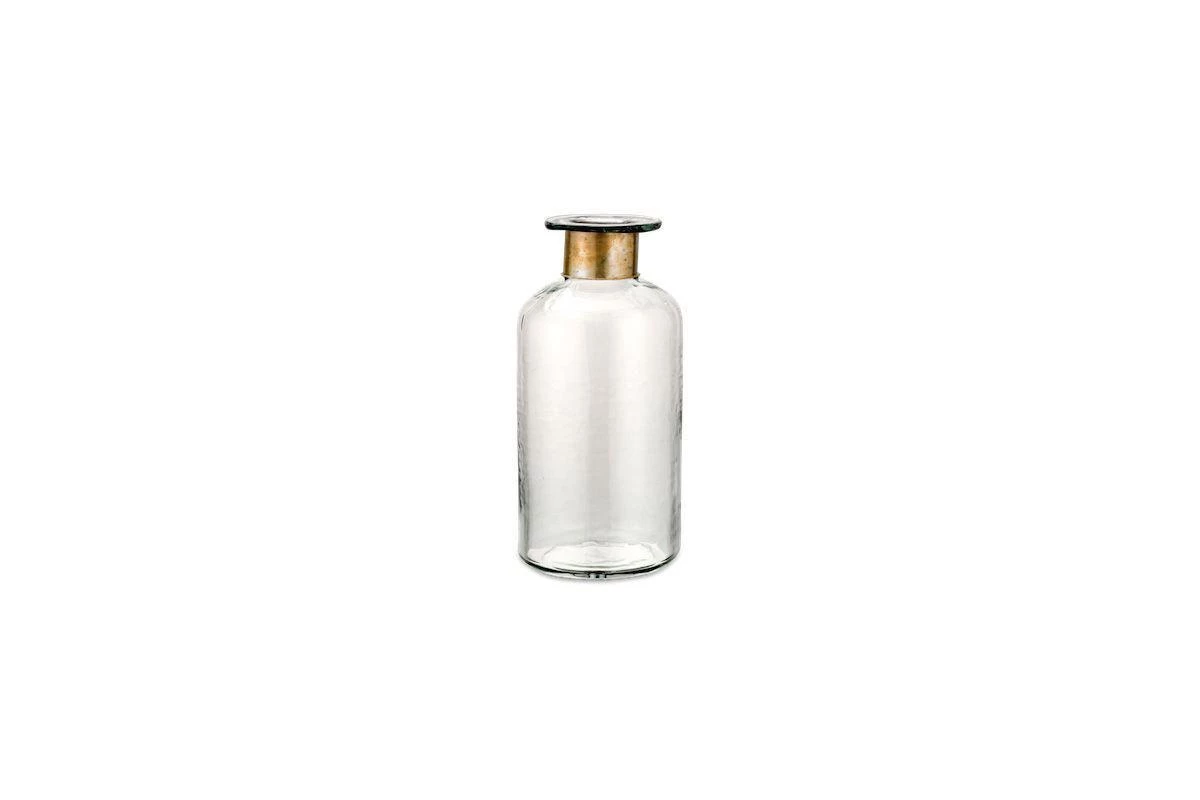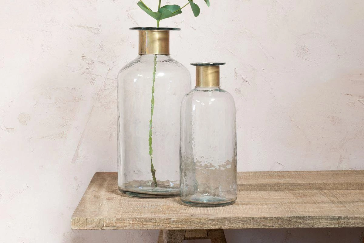 These stylish bottles have a hammered glass finish which adds depth and character. The neck is dressed with a brass ring that adds to the elegance of the piece.