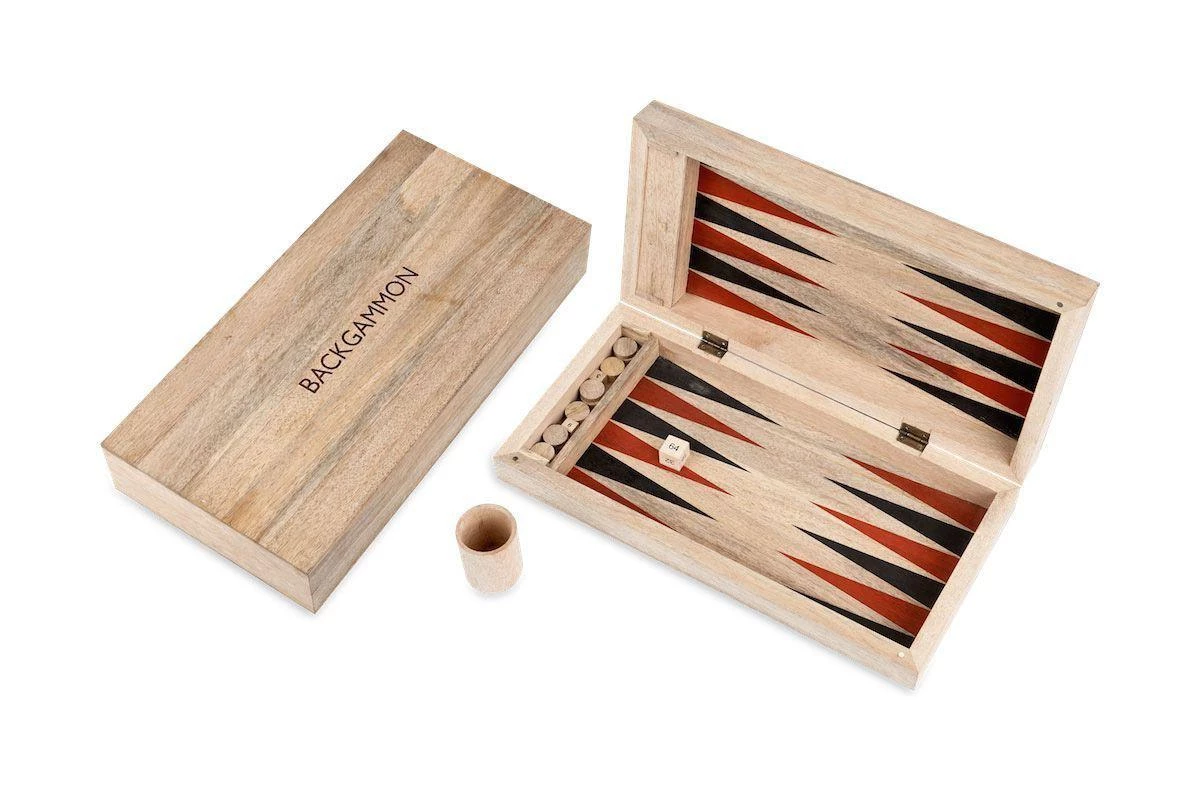 This stylish traditional backgammon set is handmade from sustainable mango wood. The board is hand painted and the set includes natural and hand painted wooden pieces.