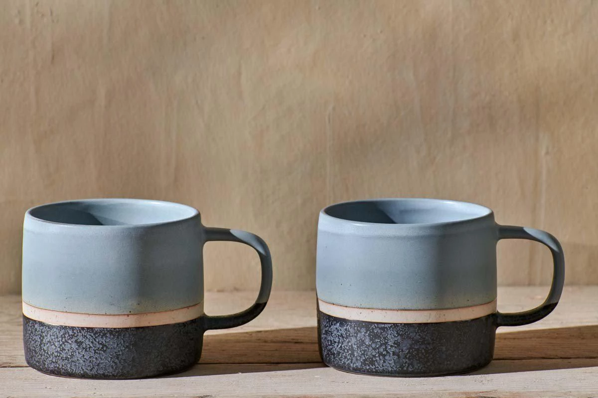 The gentle colour palette of our Enesta Dipped Mugs marries soft blue with a neutral band and dark blue base, complemented with a smooth matt finish.