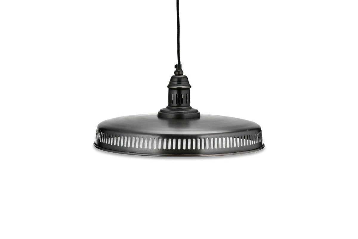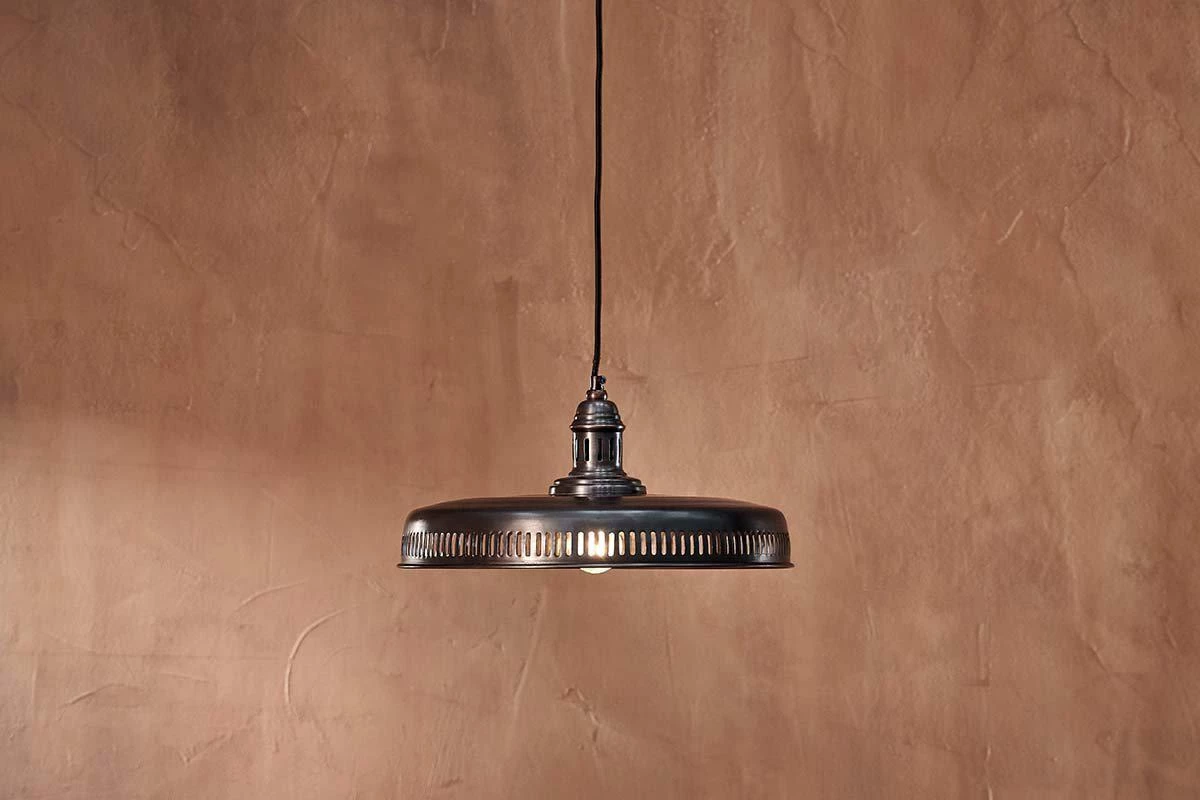 This stylish large Gabra flat pendant has a timeless, aged – bronze finish. The shallow design makes the Gabra an ideal choice for positioning over a dining table or kitchen island. The pendants feature a black fabric cord and brass ceiling rose.