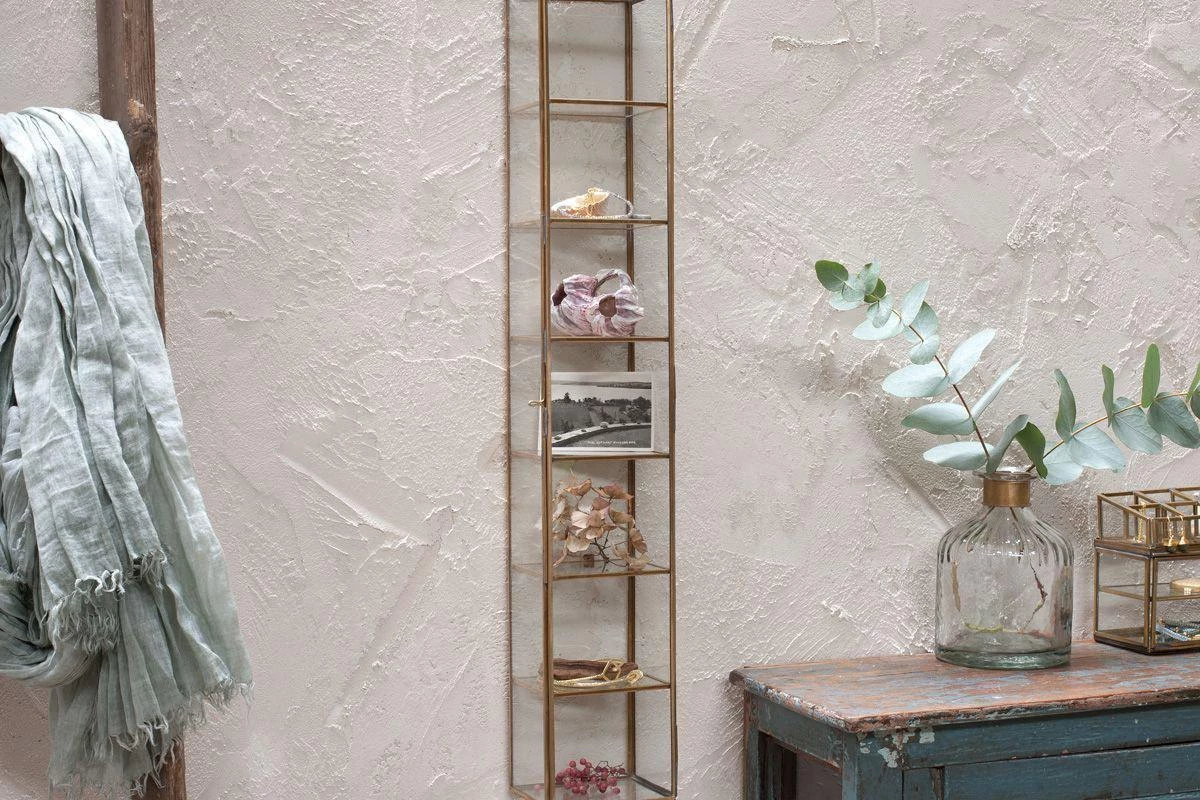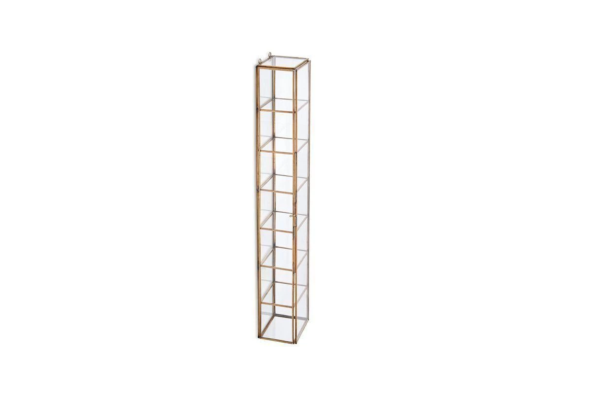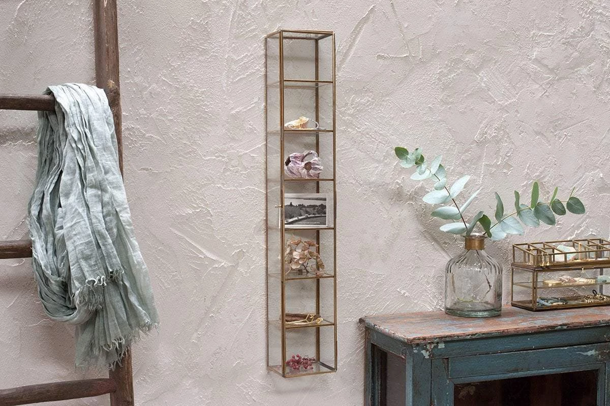 This tall elegant shelf has a brass frame with glass shelves and sides. The design makes it ideal for displaying collectables, treasures and storing jewellery.