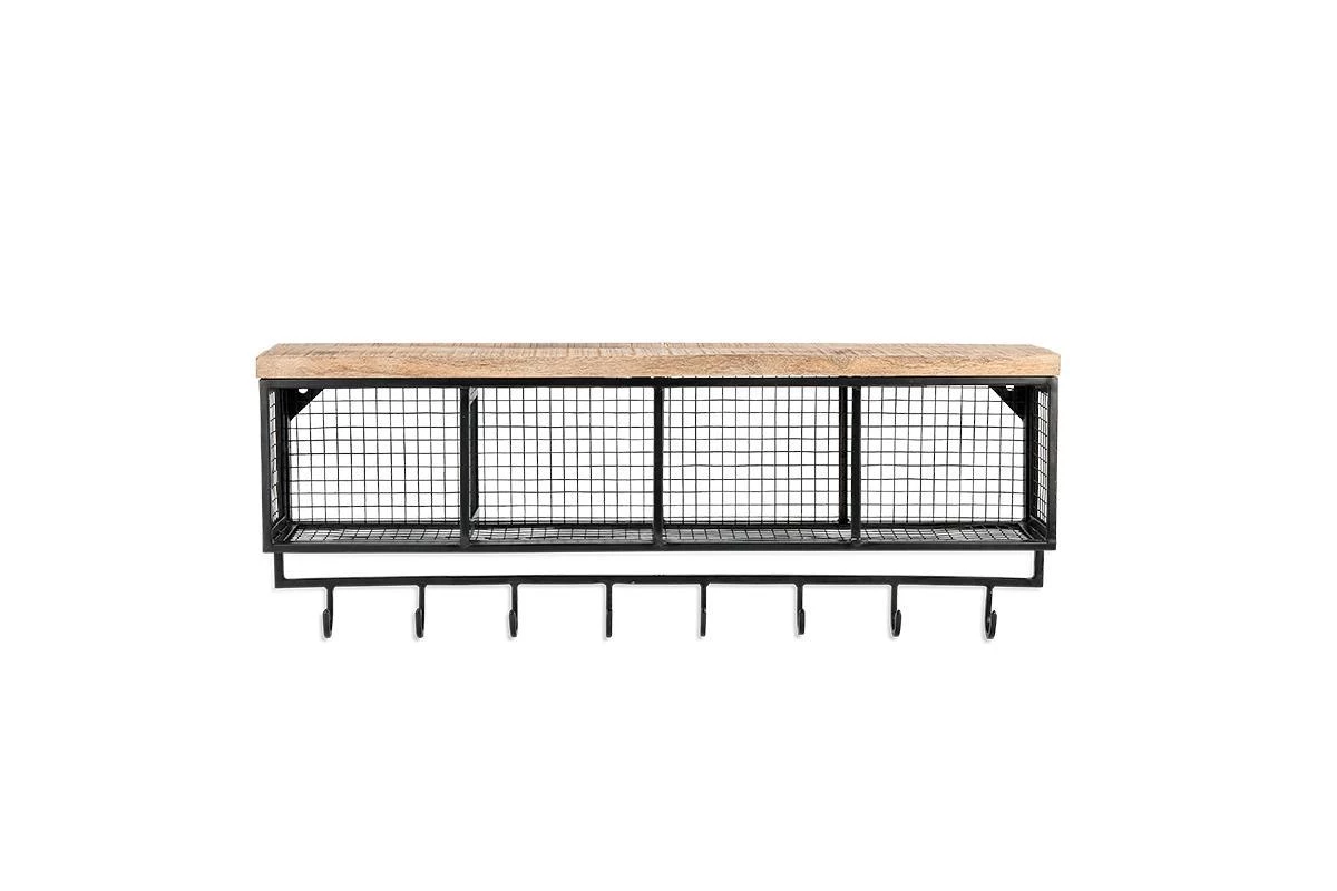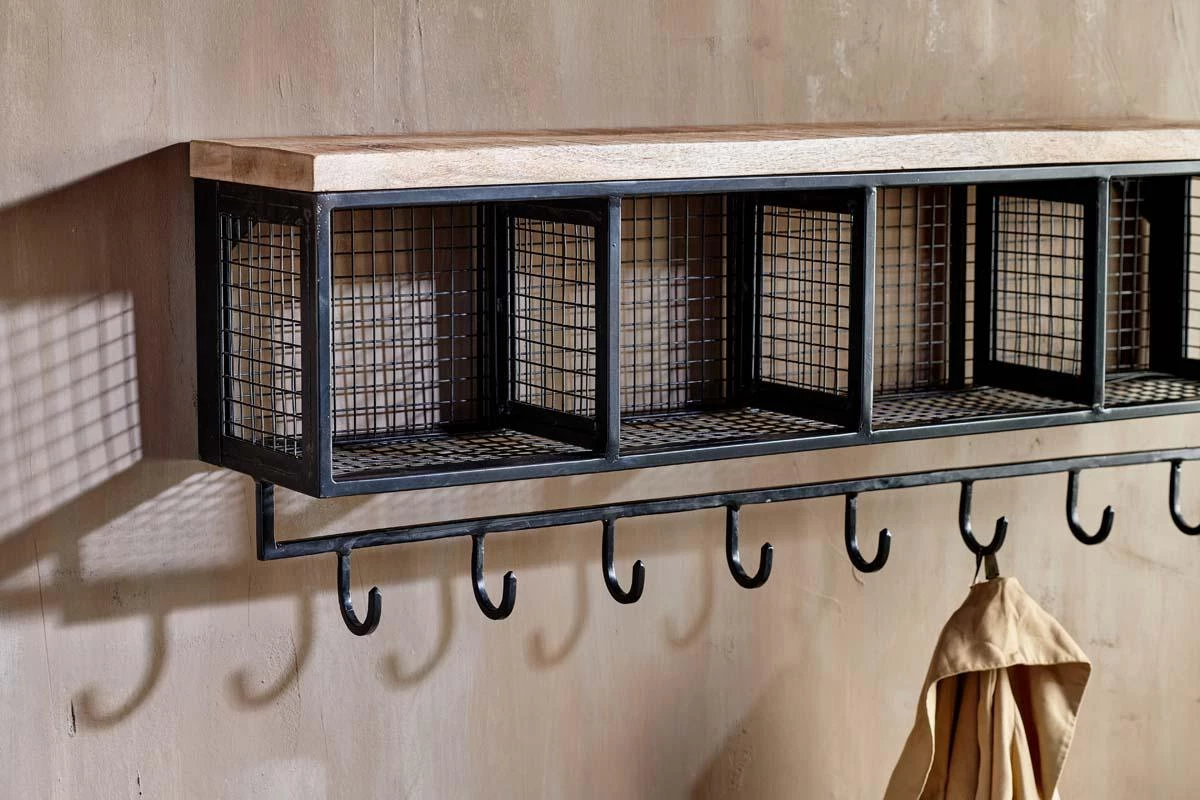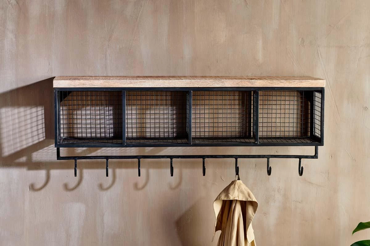 Industrial iron and sustainable mango wood combine in this functional and stylish Hasa Cubby Shelf. The shelf includes four compartments and a row of eight hooks. Ideal for small storage items such as hats and gloves, with coats below.