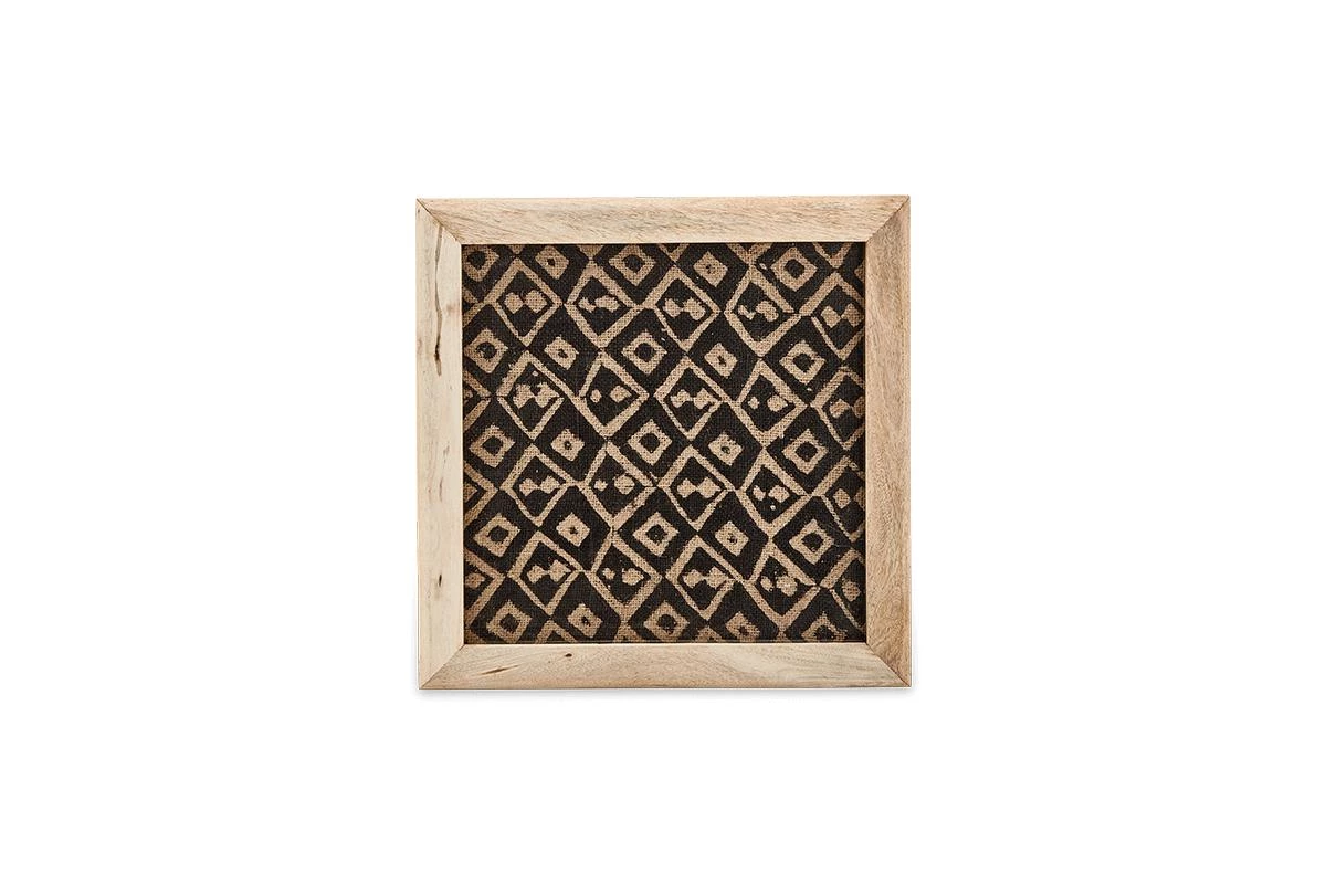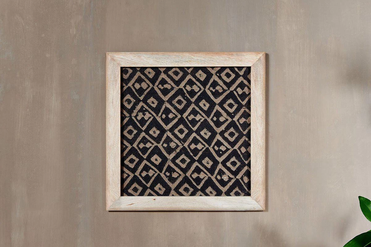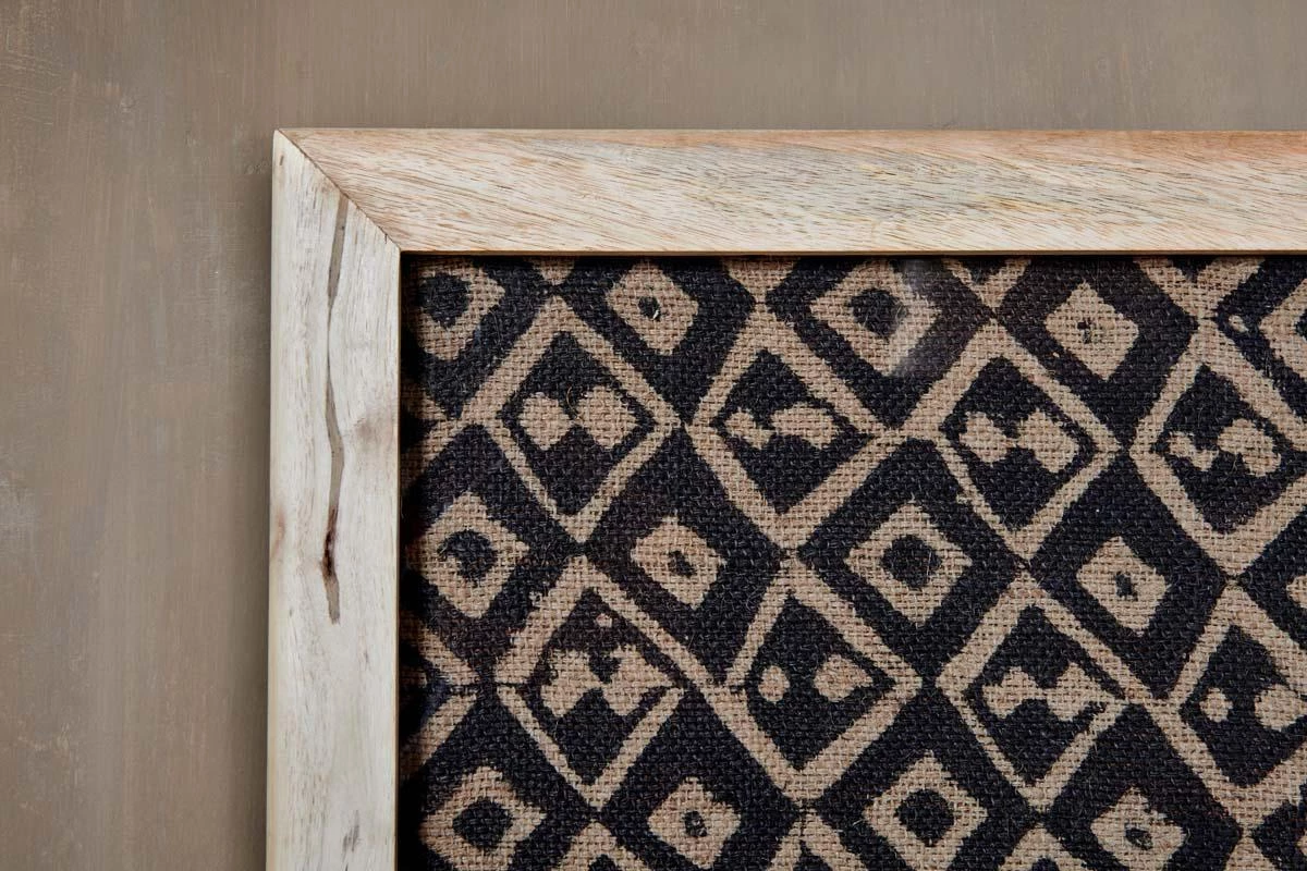 The diamond print of our Baliem artwork is expertly created by hand. The black ink design is applied using a traditional block printing method onto recycled jute fabric, the result is a stylish and textured print. Each design is framed in a handcrafted sustainable mango wood frame.