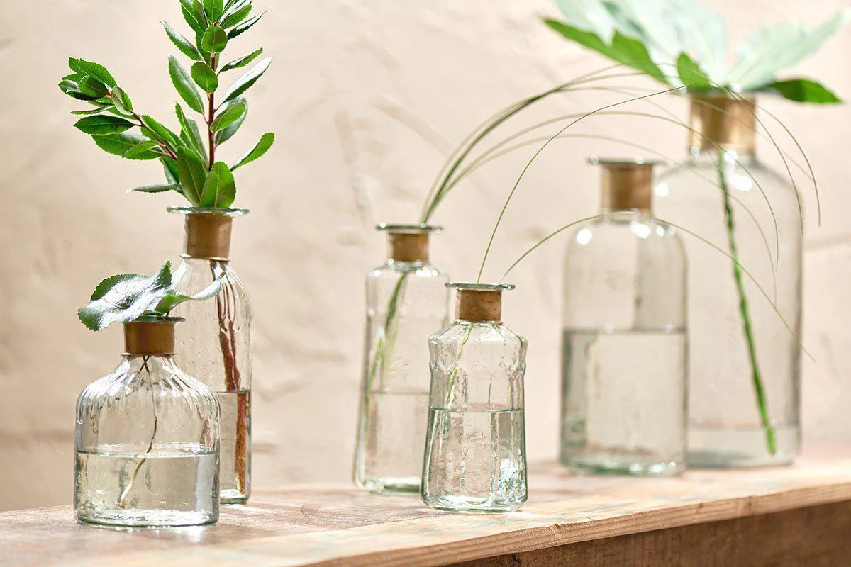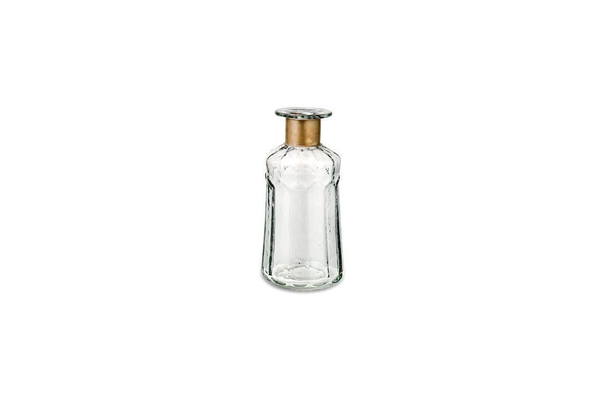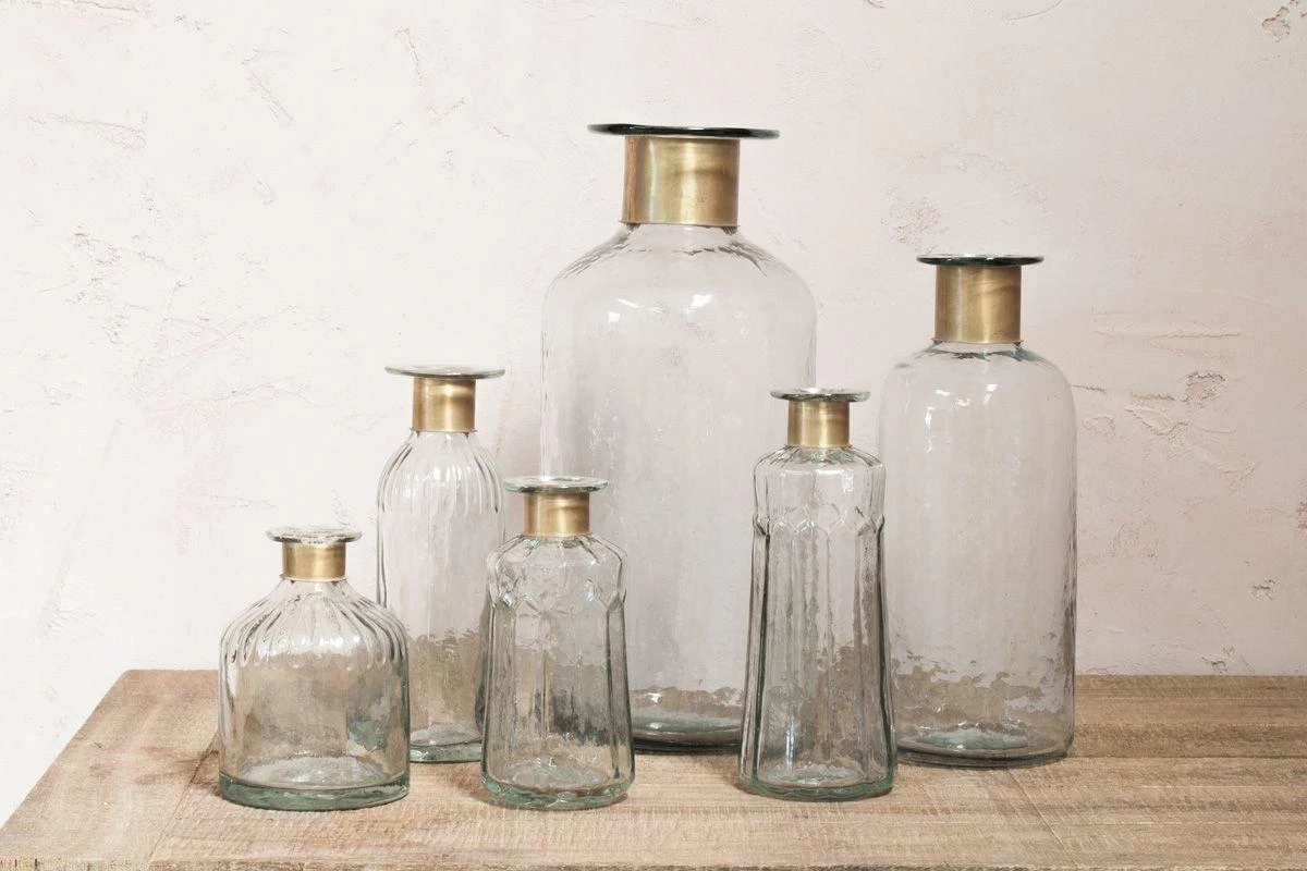 These well-designed bottles are dressed with a brass neck and attractive indentations to the neckline. The glass has an attractive hammered finish.