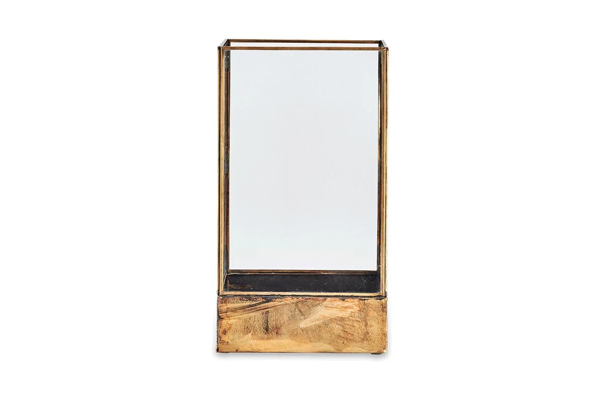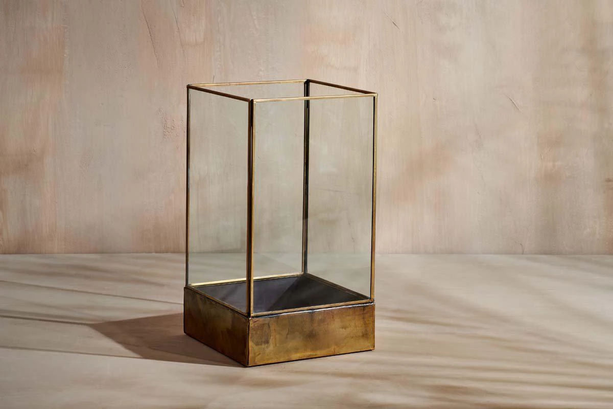 Our tall Sampara Storm Lantern makes a striking centrepiece, its appealing antique patina is complimented with a deep brass base and elegant contours. Display with a church pillar candle and create a warm, soft atmospheric light.