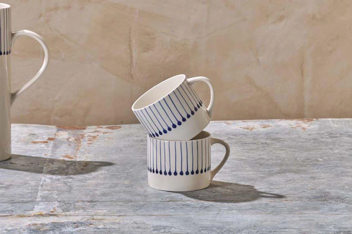 The eye-catching matchstick design of these small Iba mugs is hand painted by a fine brush. The deep indigo blue stands out against the white backdrop.