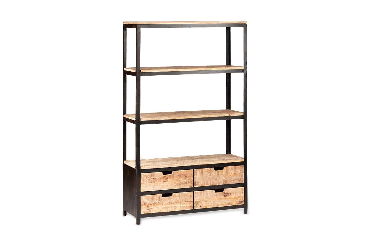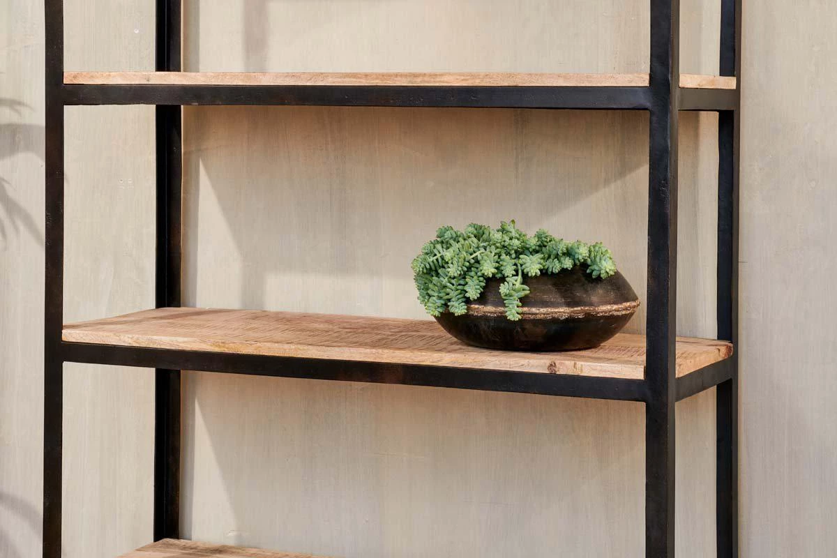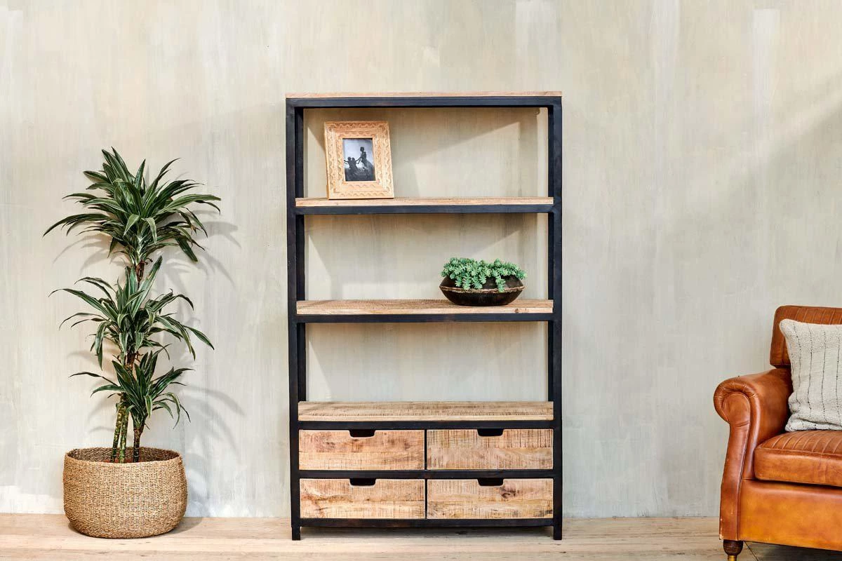 Practical, industrial storage defines our Nermada Shelving Unit. The open shelving is ideal for home office storage space or displaying crockery in a kitchen. The unit includes four shelves, handmade from sustainable mango wood, as well as two deep wooden drawers, useful storage to hide away the items you do not want on display. The neat cut-out handle design adds to the look of the piece. Marry with other pieces from the Nermada collection for a harmonious and stylish home.