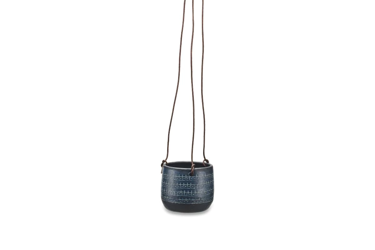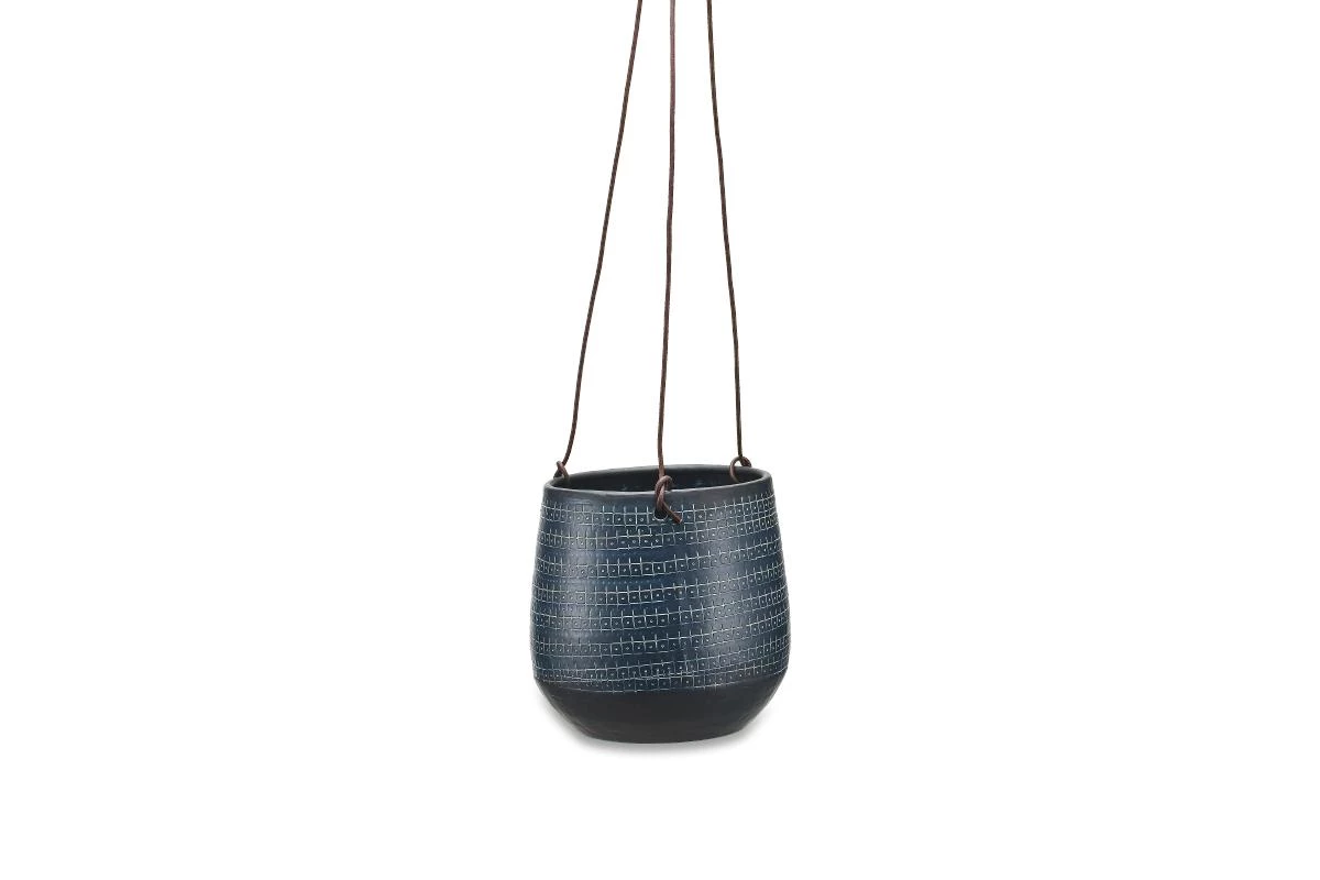 The eye-catching pattern on these Mahika hanging planters is beautifully crafted by hand. The design gives each one a unique feel and adds to their tactile qualities. The dark metal finish provides a stylish contrast to the verdant greens of indoor plants.