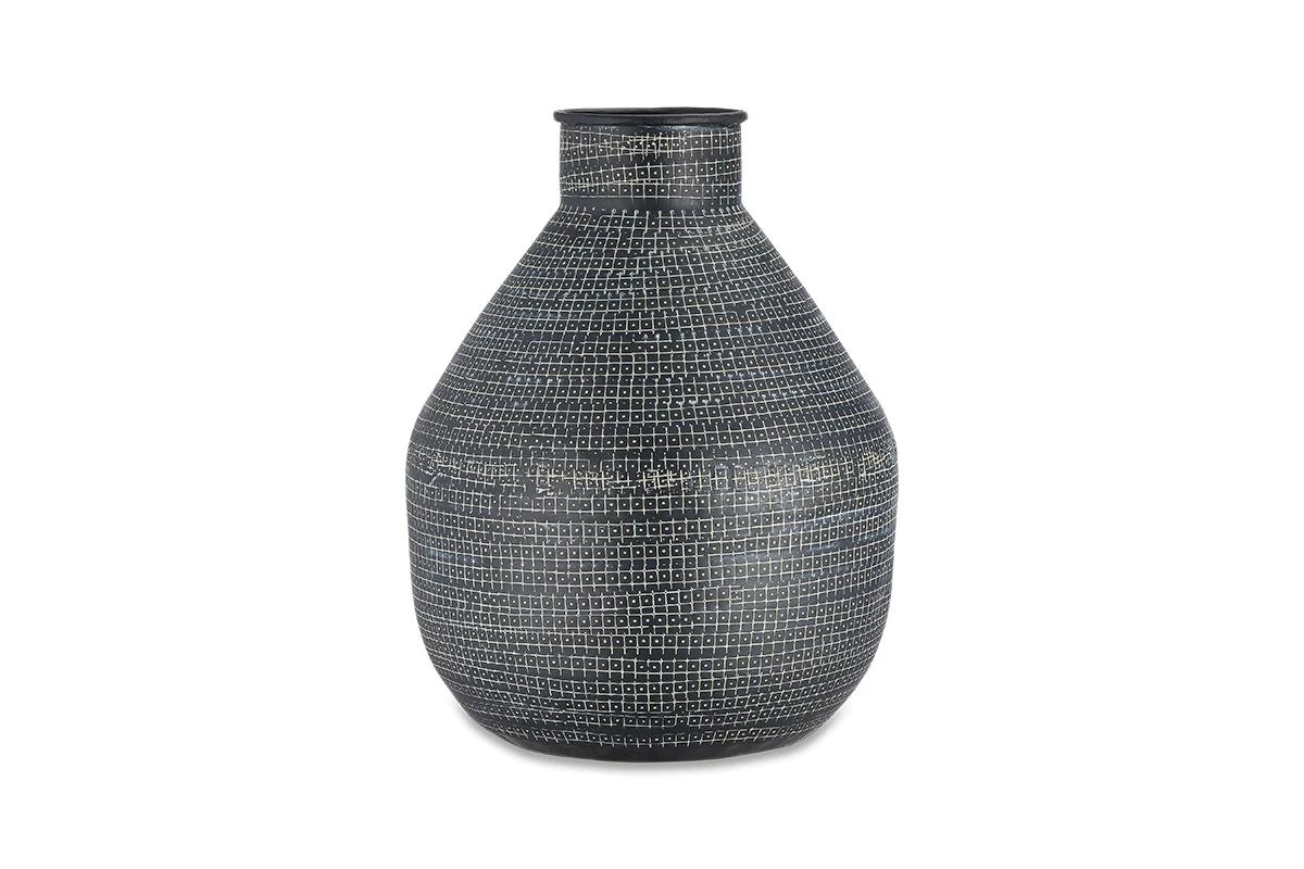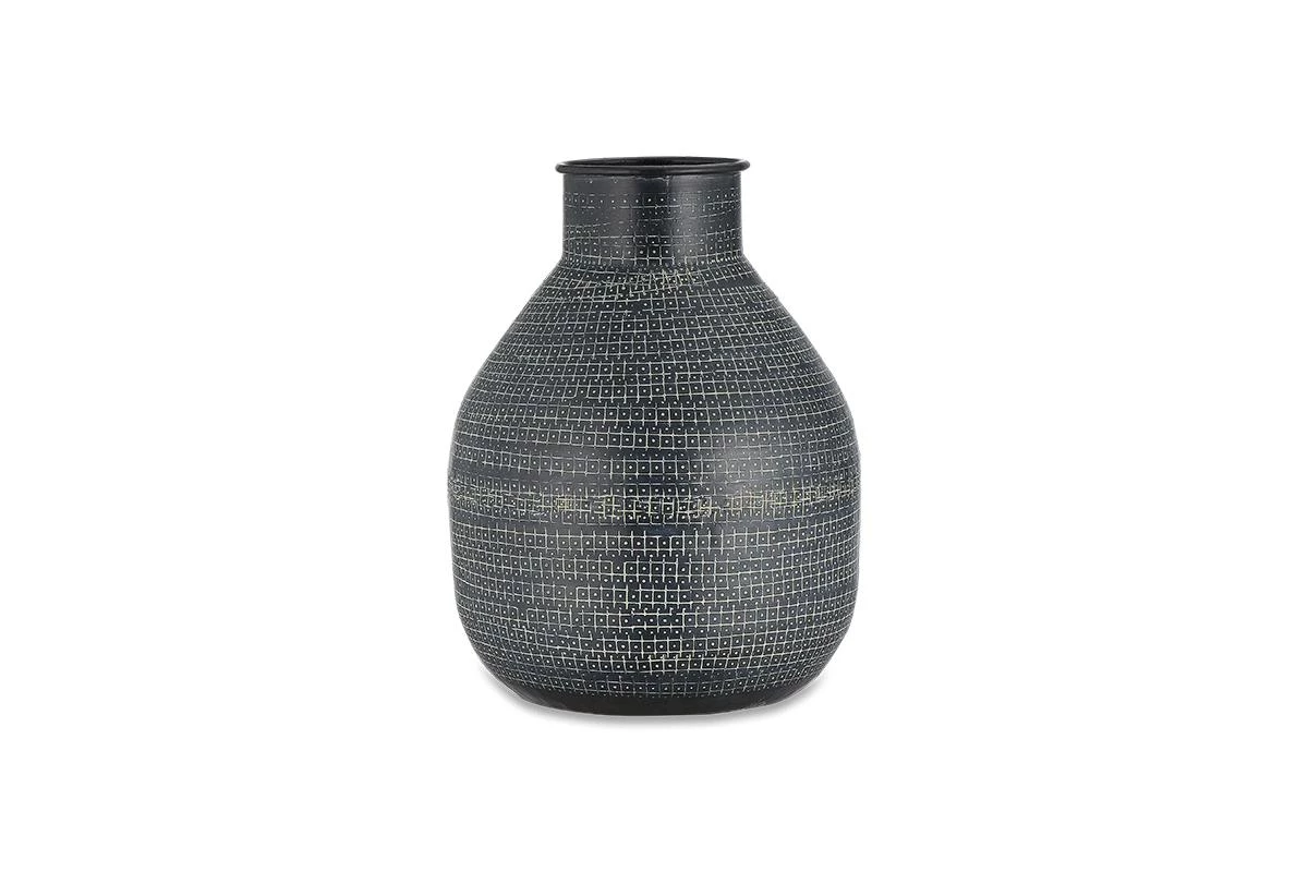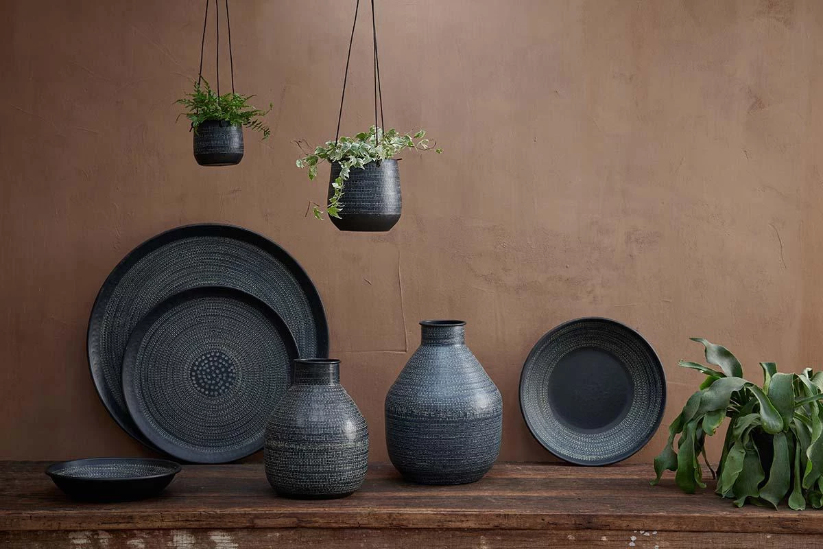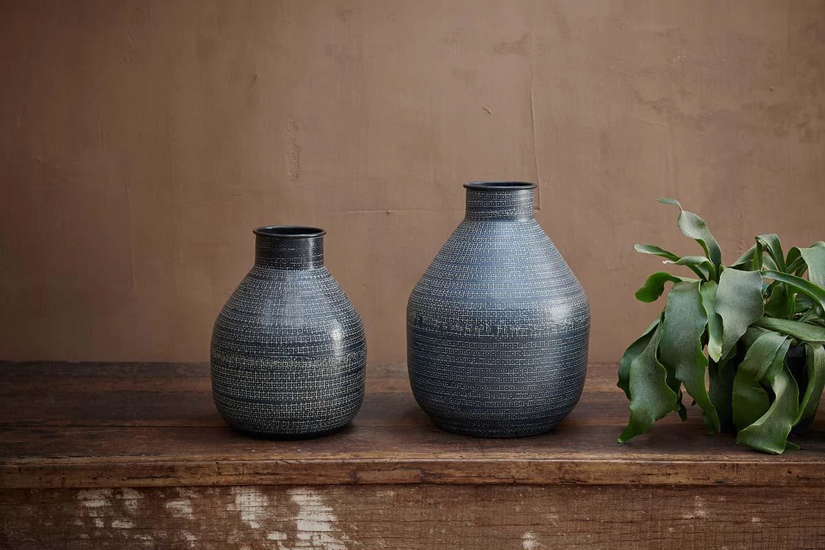 Strikingly imprinted using traditional tools, our Mahika vases have an eye-catching pattern and soft, organic shape. Perfect for dressing a sideboard or adding interest to shelving. The matt black finish provides a contrasting backdrop for dried flowers and fresh blooms.