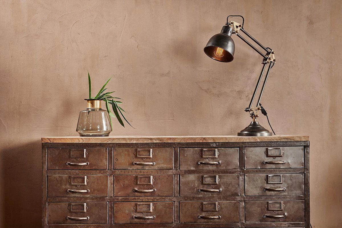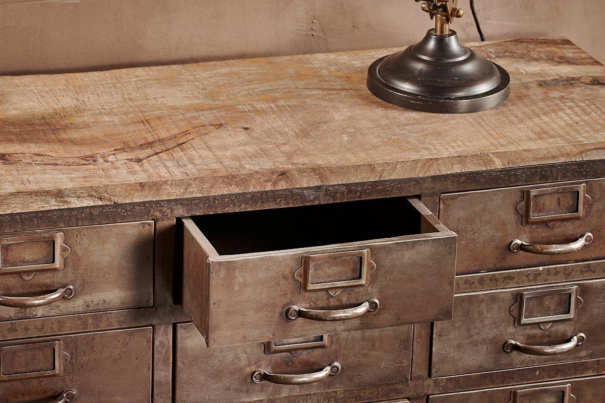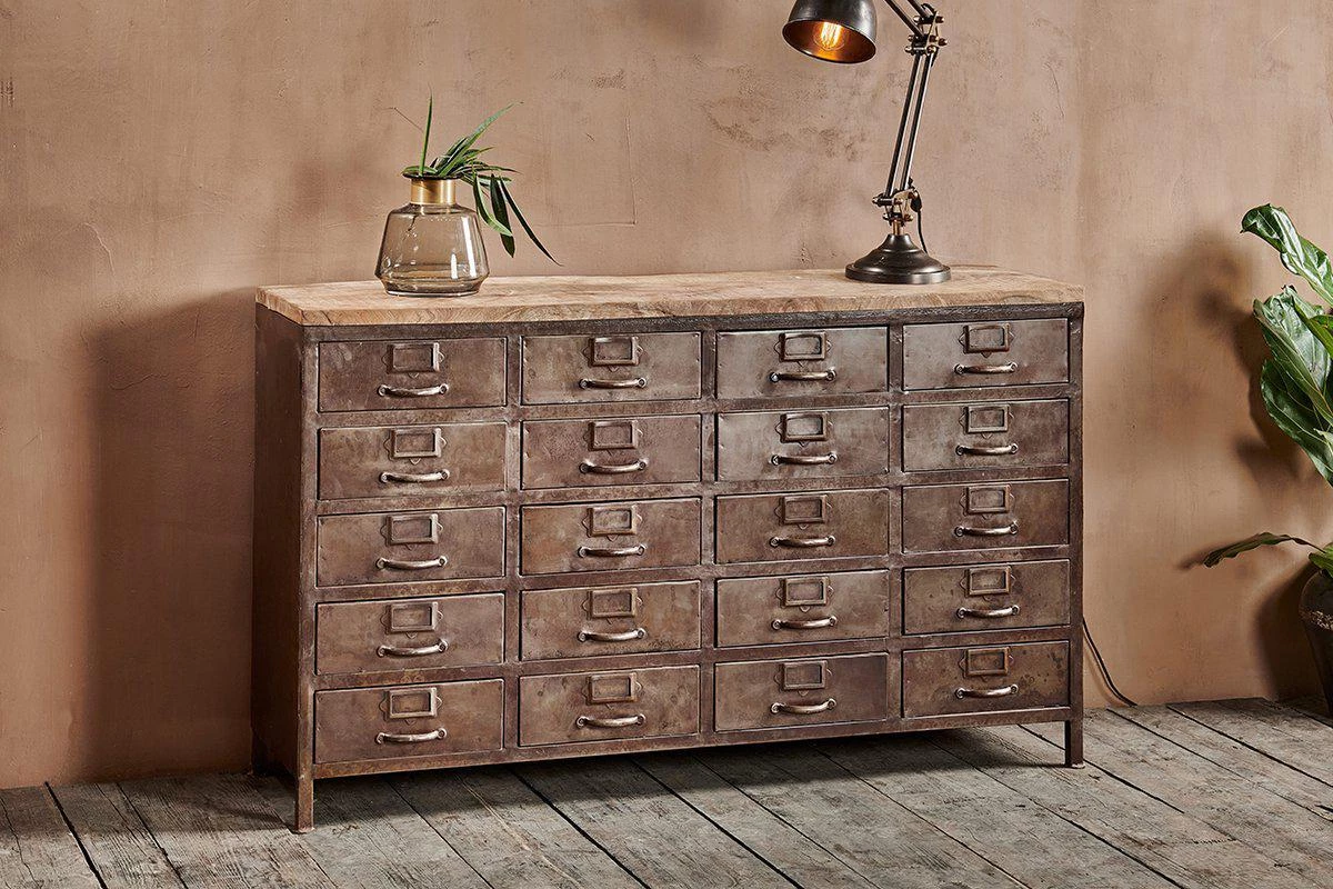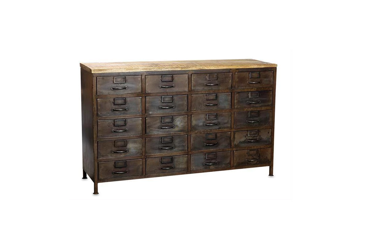This timeless cabinet combines twenty metal drawers with metal label holders and a distressed black iron frame and a sustainable mango wood top.