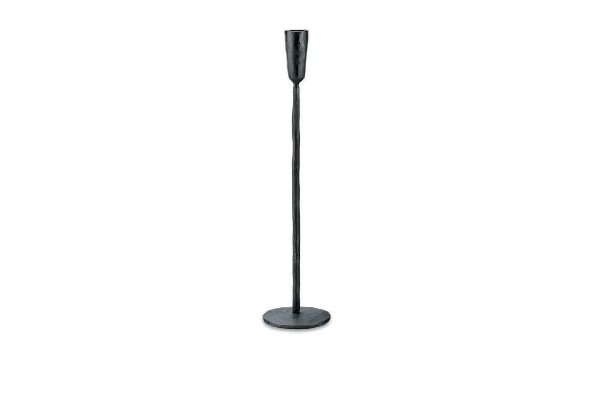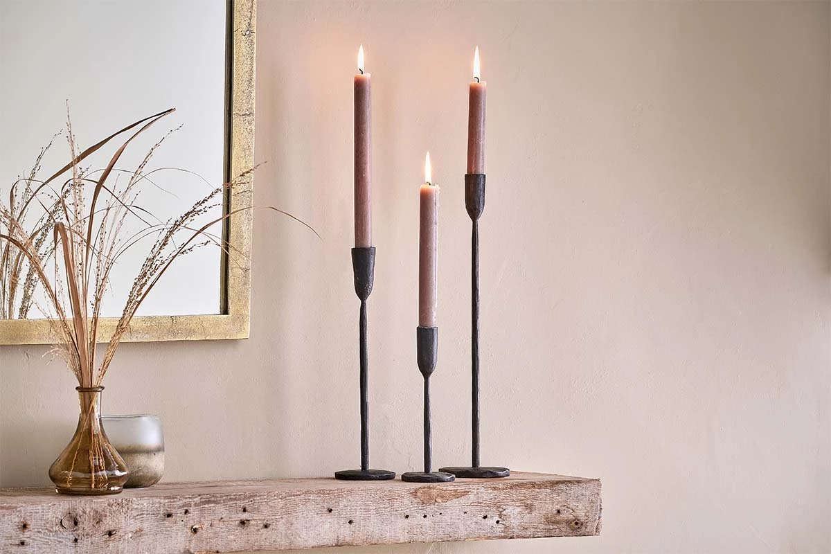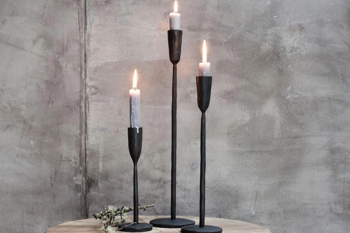These simple solid brass candlesticks are finished in striking antique black. They are designed to hold a standard dining candle.