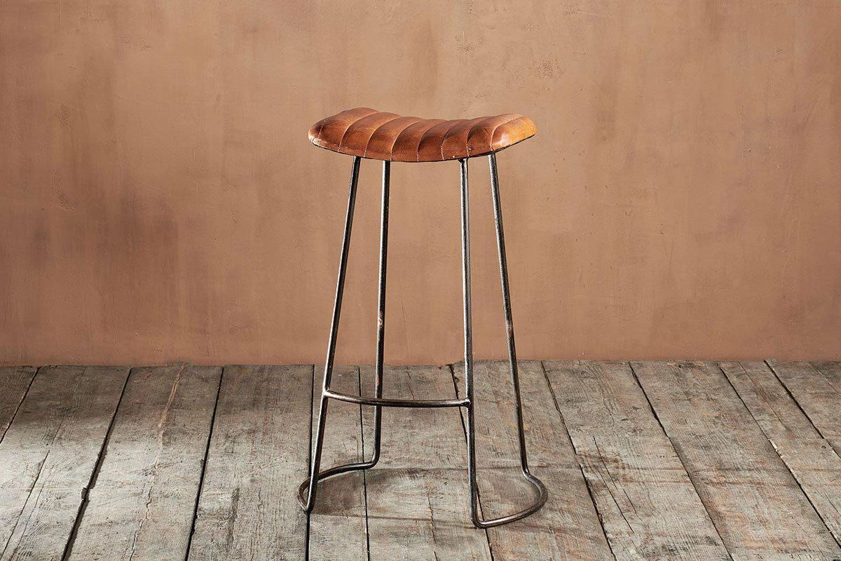 This industrial looking bar stool is made from dark iron and aged leather. The padded leather seat has a stylish ribbed detail.