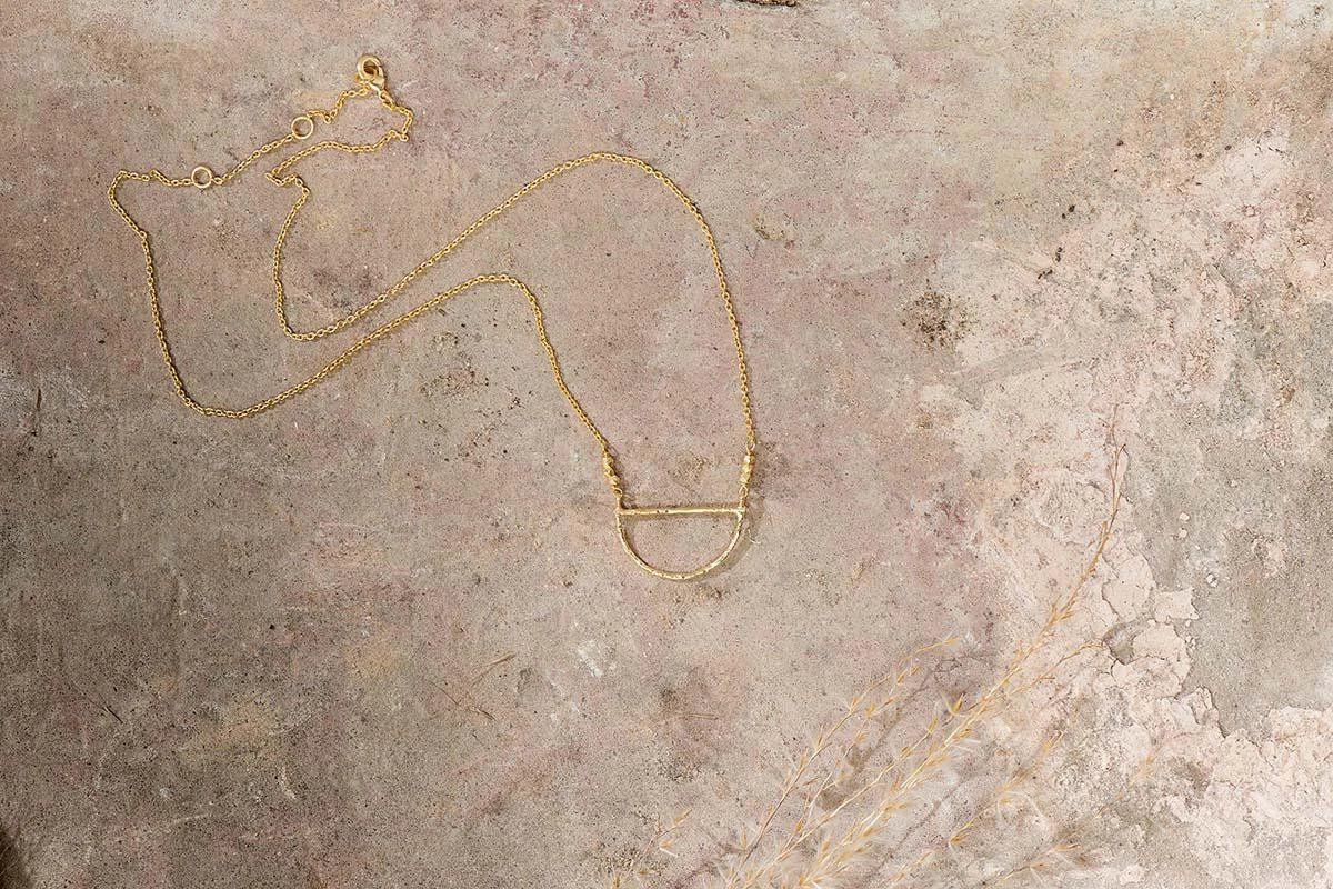 Beautifully delicate, our Nuba necklace is hand crafted from hand shaped gold beads, embellished with natural Prehnite stones. The overall affect is stunning.