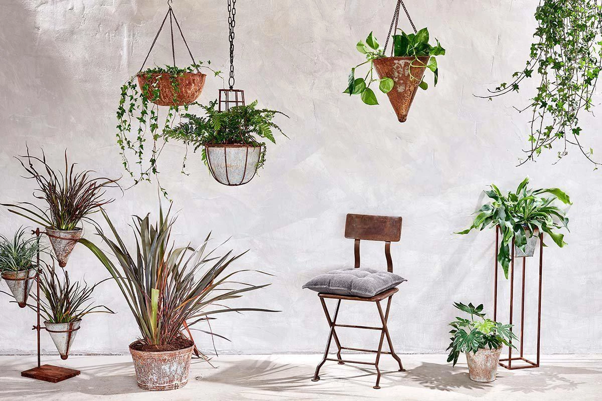 These well proportioned zinc hanging planters are supported with a rust coloured cage, that offers support and structure to the plants within.