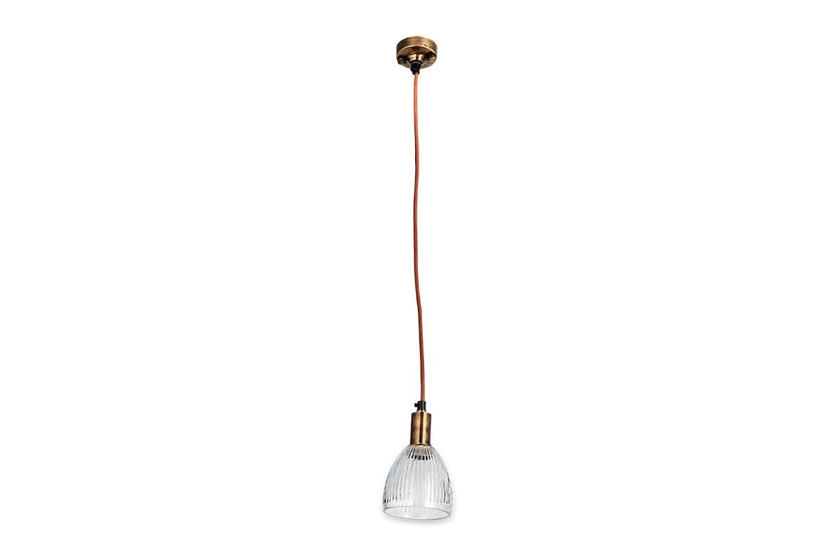 The endearing and elegant design of our Rarni Pendant combines ribbed glass with aged- brass fittings and a rust fabric cord. Style in multiples along a table or above a kitchen island.