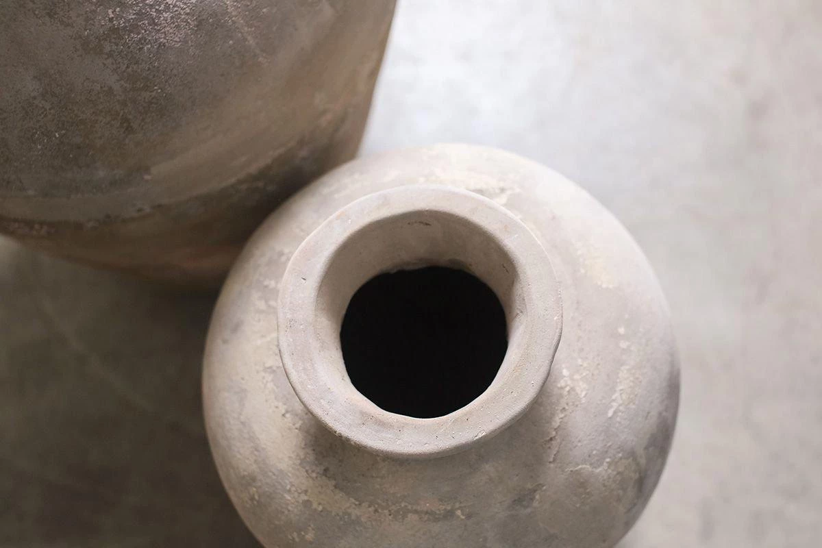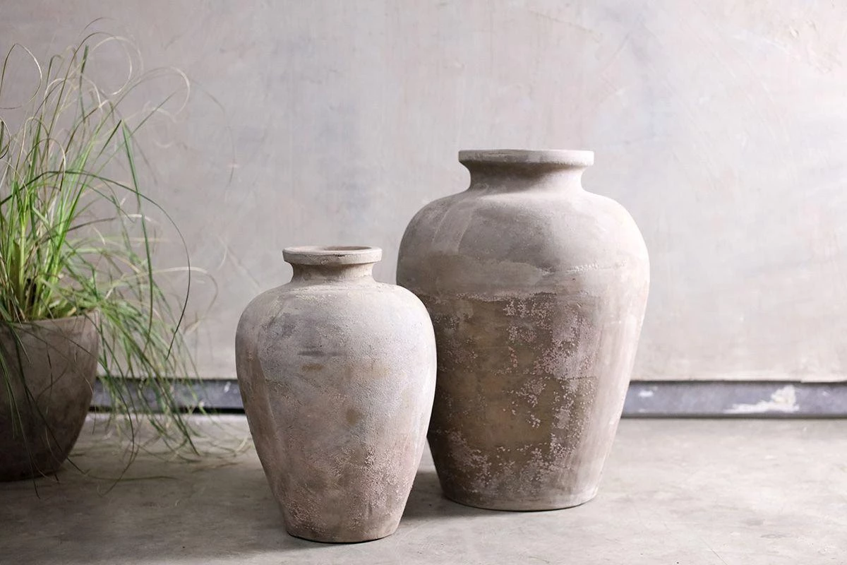 These traditional urn shaped clay pots make an elegant addition to a garden or inside space.