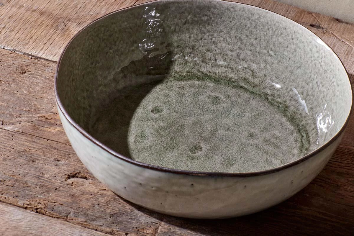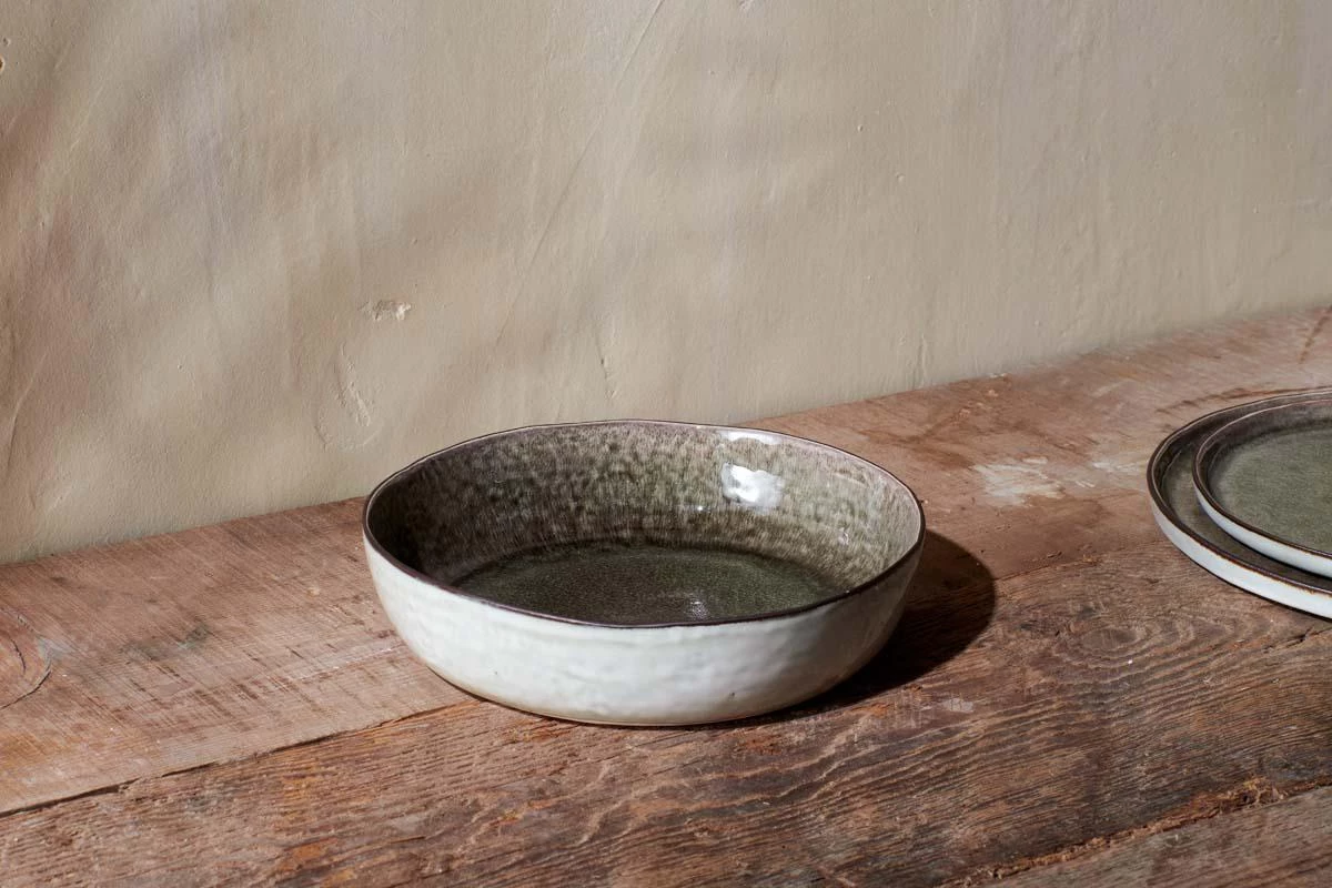 Our low sided Simi Serving Bowl has a deep moss green glaze, set off by a contrasting exterior off-white tone. Ideal for salads, breads and sharing dishes.