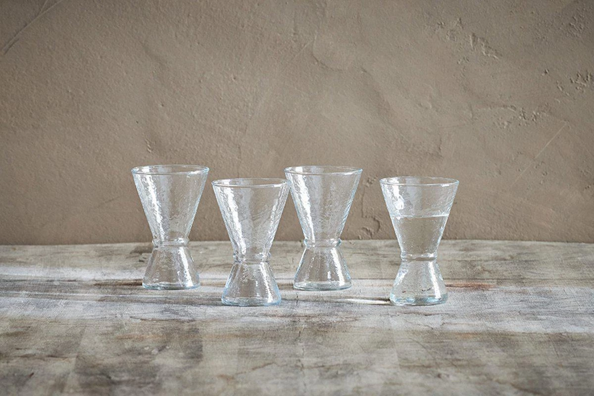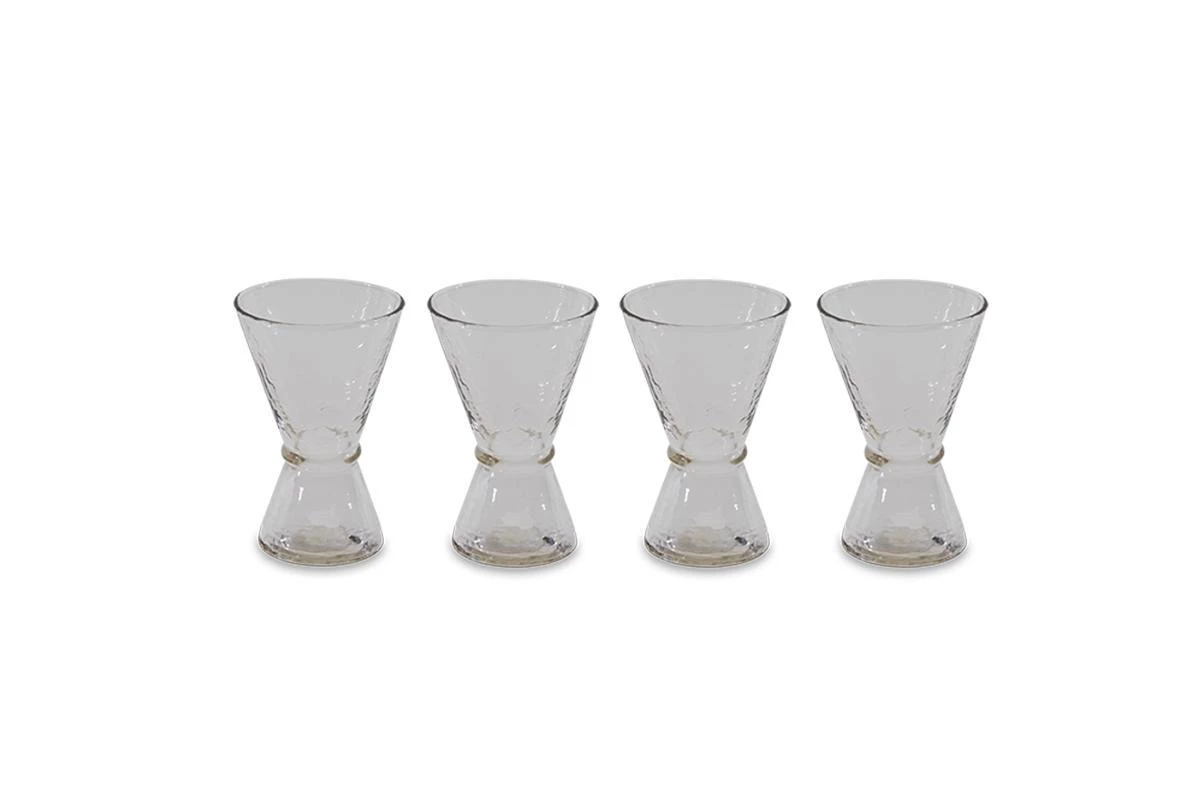 This gift set of small rustic, hand – blown wine glasses is a pleasure to behold. The glasses are hammered when still molten, creating this textured edge that catches the light and adds a tactile quality to each glass. These wine glasses have a unique design, the shape curves in and out in a conical shape.