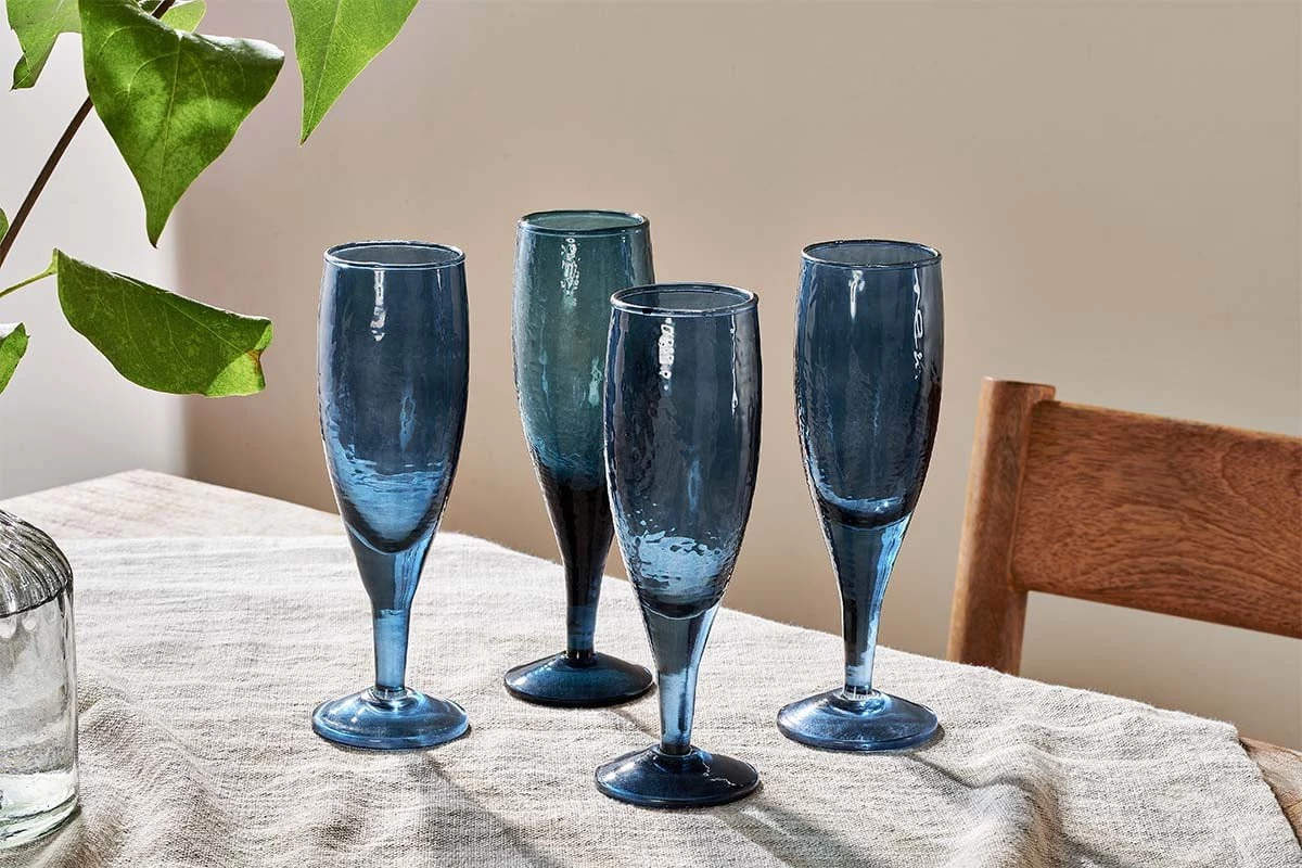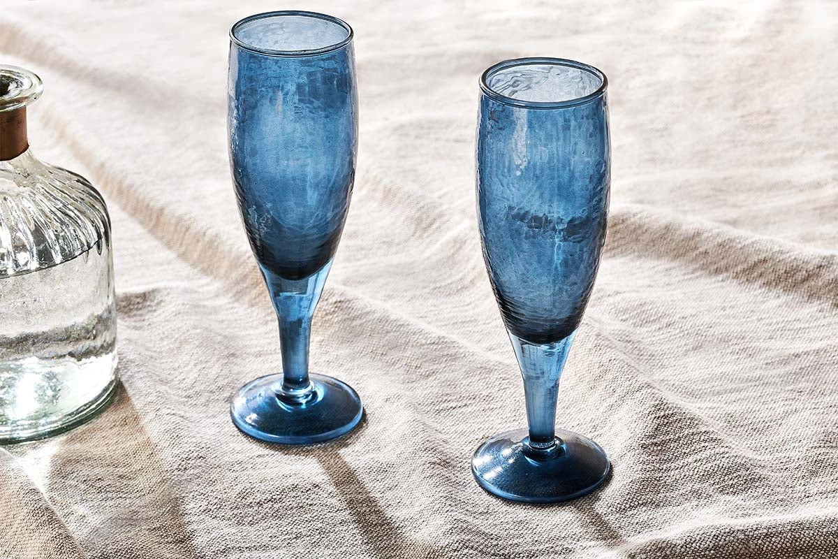 Celebrate in style, with our deep indigo blue Yala Champagne Glasses. The deep tone marries beautifully with the hammered glass finish.